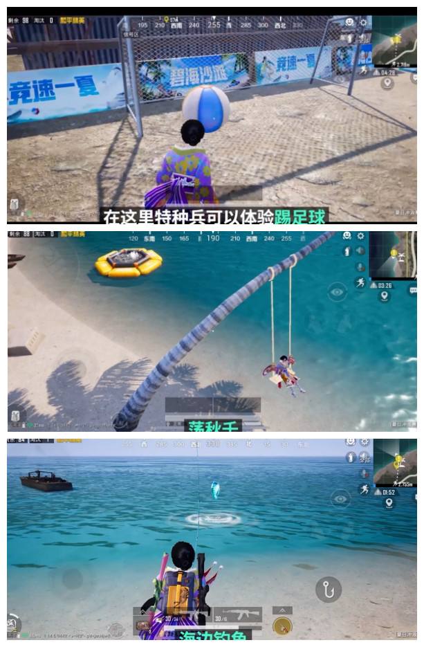 首先是沙滩区,地图上会固定刷新四个椰子树打卡点,特种兵们可以前往打卡并体验夏日的快乐,在这里特种兵可以体验踢足球、荡秋千、海边钓鱼以及跳伞等。