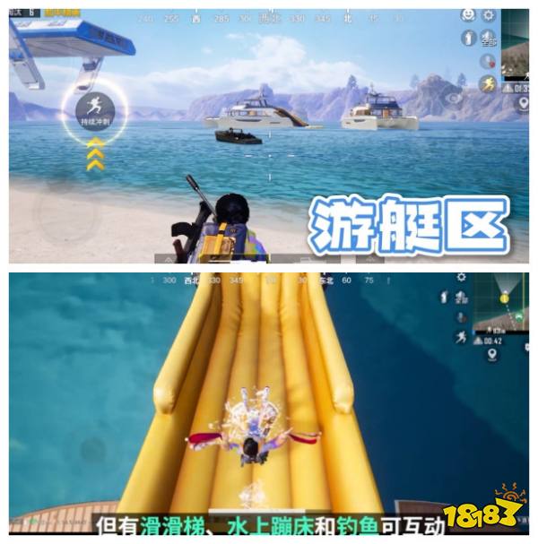 在海上会固定驻留几艘游艇,这里的游艇是不能开的,但有滑滑梯、水上蹦床和钓鱼可互动,通过钓鱼可以获得物资奖励,在附近还会固定刷新冲浪板跟反重力摩托