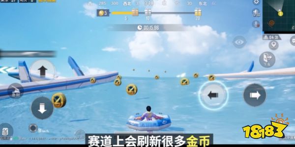 来到冲浪赛道起点后会自动获得轮胎艇,接着就可以开始玩冲浪赛了,赛道上会刷新很多金币,特种兵们只要靠近金币就会自动拾取。