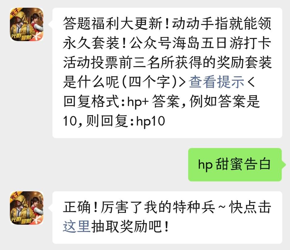问题:公众号海岛五日游打卡活动投票前三名所获得的奖励套装是什么呢?