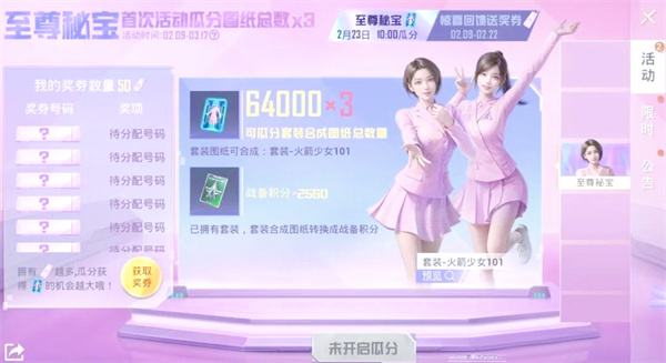 最近,一张来自游戏中的截图引发了玩家的热议。截图显示了一个名为“至尊秘宝”的新主题活动,活动时间为2月9日至3月17日。在此期间,玩家可以通过“瓜分套装合成图纸”的方式,用图纸合成火箭少女101套装。如果这一消息属实,那么无数老玩家将有机会再次拥有这套备受喜爱的皮肤。