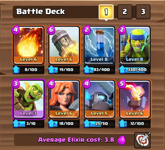 在1:x之后,在桶马上落地的时候将女武神顶在敌方半场最靠前最中间的那一格。女武神会瞬间接过两个皇家塔的仇恨,让三个哥布林无伤输出。如果手头没有女武神,也可以用小皮卡来顶在前边。桶落地之后马上跟火球之类的法术砸塔来消灭对手的防守生物,并且女武神会走向箭塔来输出。