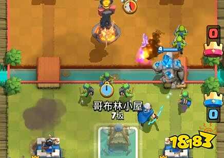 2、防守:由于本套卡组缺少圣水收集器作为圣水支撑,因此石头人在双倍圣水阶段前最好不要轻易使用,否则很容易被敌方使用野蛮人精锐、野猪等突进型兵种换路偷袭,得不偿失。建议前中期尽量以低费卡牌赚费解场为主,必要时可搭配火球、小电两张法术卡牌进行辅助防守解场,待防守完毕后继续下出哥布林小屋来不断消耗敌方公主塔血量。如果敌方前期亏费较为严重,就可以转守为攻,沉底石头人来打出一波强势的进攻。