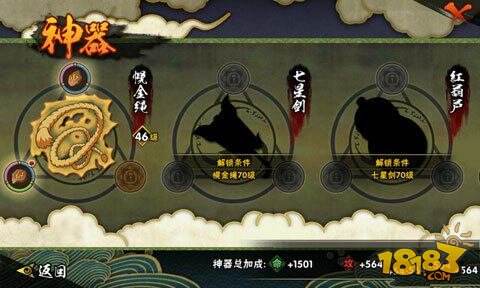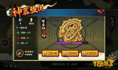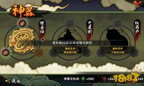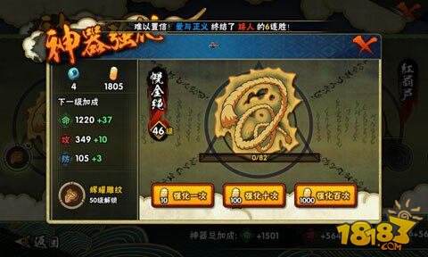 而在神器的内容结构中,升级结构主要是忍玉参与的过程,玩家只要将所收集到的忍玉进行添加强化,到了一定升级进度就能够完成对神器的升级。