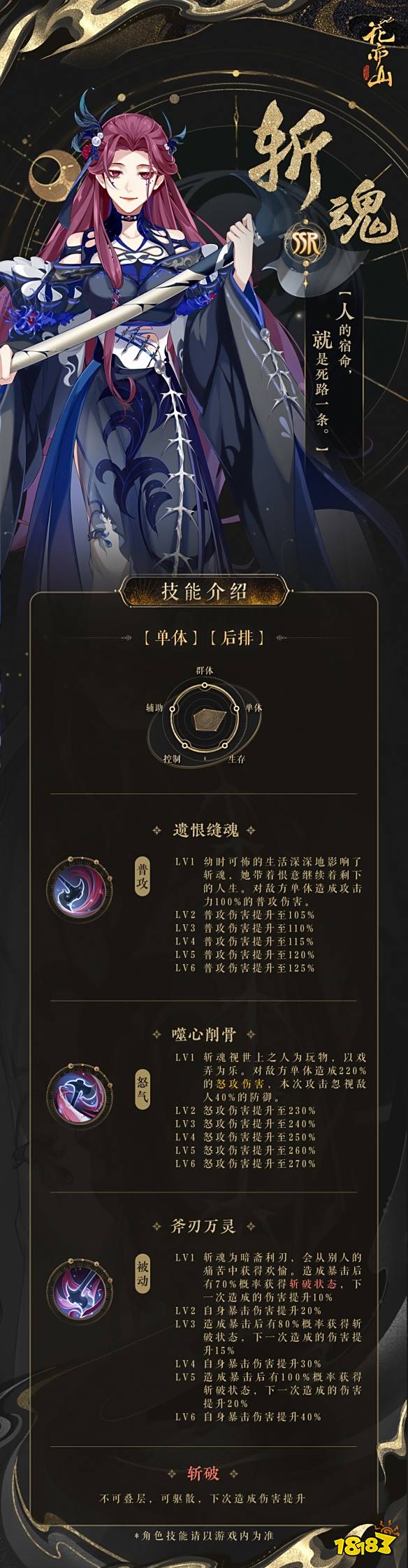 花亦山心之月斩魂技能介绍:名士:斩魂,配音:李蝉妃,暗斋总旗,手段残忍,令人闻风丧胆。