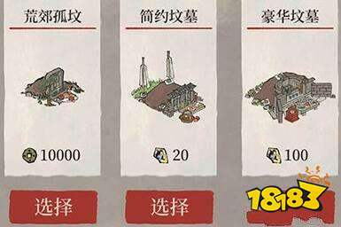 游戏后期玩家们会遇到居民死亡的情况,这时候玩家们就需要购买坟墓,坟墓分成三种有荒郊孤坟、简约坟墓、豪华坟墓三个,每个坟墓都有不同的价格,玩家们可以根据自己的实际情况选择适合的坟墓。