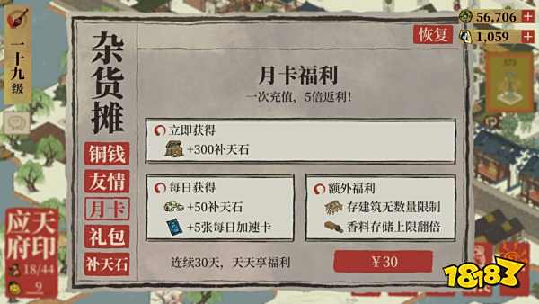 三、月卡福利(一次充值,5倍返利)30rmb:
