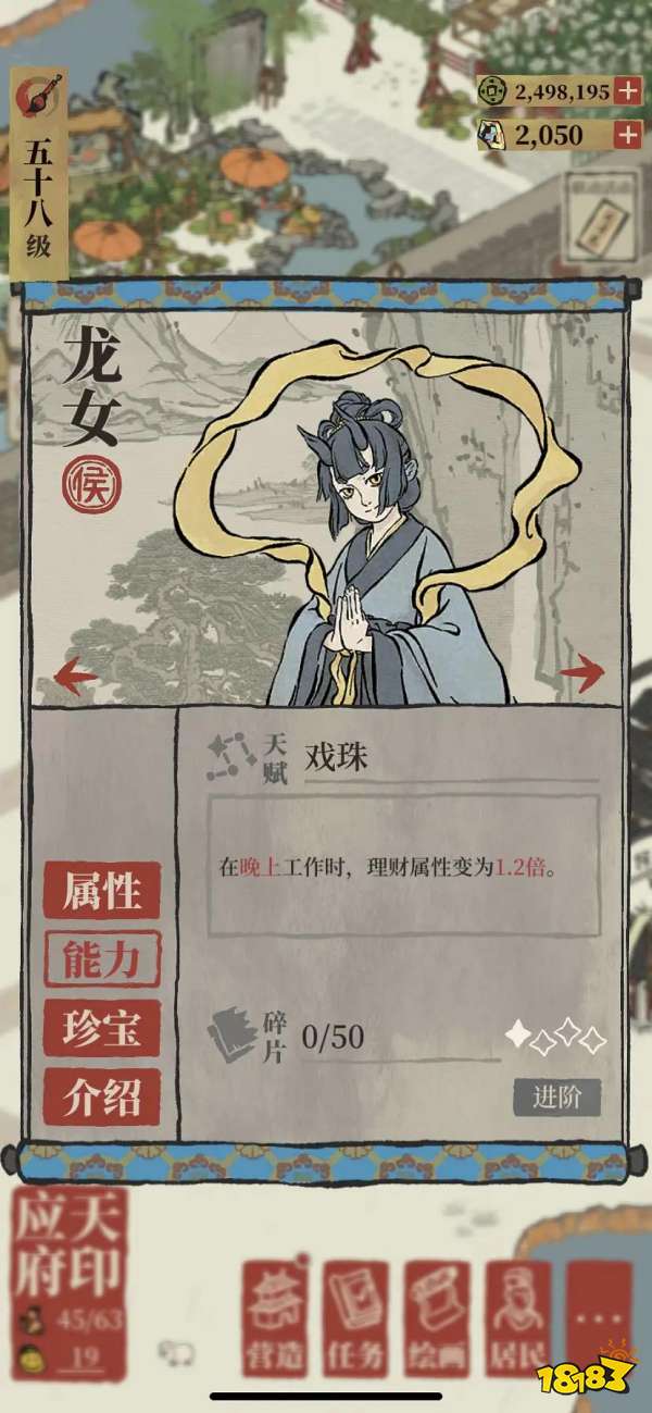 1、龙女是个侯级角色,适合搭配增加制作的珍宝,龙女的天赋在晚上发挥作用;