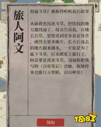 1、玩家读完旅人阿文发过来的一封信得知,阿文曾经也喜欢斗草。