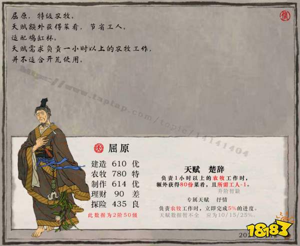 满级属性:建造610,农牧780,制作614,理财90,探险435