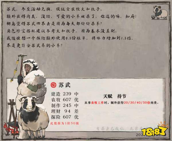 苏武非常可爱,背着一个小羊,类似大和抚子,可以额外获得肉类,新晋铲屎官。