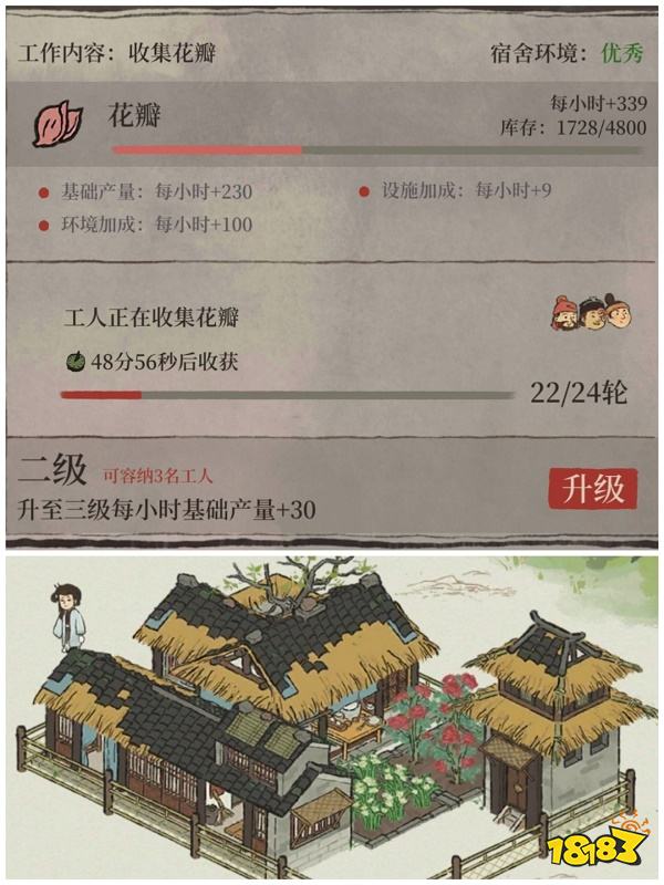 6.宿舍升级后+30,但要多用一个普通居民,花瓣的初始库存是1800,库房能+3000~普通居民一安排就是24小时,除非花瓣爆仓才会停止~