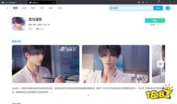 第四步:点击进入《恋与深空》游戏详情页即可进行游戏安装和游玩了(由于游戏还未公测,玩家可以先点击预约,等游戏公测后,模拟器就会自动帮玩家安装游戏,届时就能够第一时间进入游戏游玩了)。