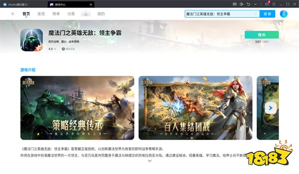 第四步:点击进入《魔法门之英雄无敌:领主争霸》游戏详情页,即可进行游戏获取(目前游戏还未上线,玩家可以点击进行预约,等到游戏上线后,模拟器就会第一时间帮助玩家进行游戏安装了)。