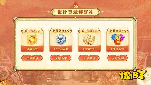 3.累计登录礼包:累计登录1天,可领取100w师贡;累计登录3天,可领取1级宝石*1;累计登录5天,可领取100w师贡;累计登录7天,可领取无字决。