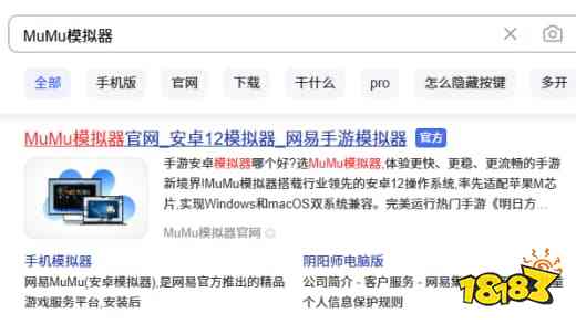 首先第一步我们需要通过浏览器搜索“MuMu模拟器官网”或者直接搜索“MuMu模拟器”,看到带有【官方】标识的链接点击进入。
