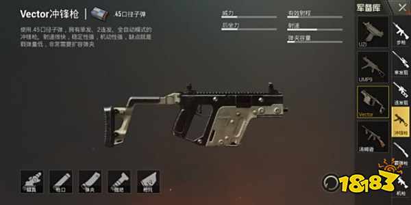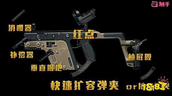 在配件的选择上,Vector最关键的配件,必须要有快速扩容弹夹,真的很需要25发子弹,实在不行就用扩容弹夹,又不难找。测试服Vector可以装轻型握把和半截式握把,如果登陆正式服建议大家选择半截式握把!最好的瞄准镜推荐红点,因为主要应付近战,全息太厚实遮挡了太多的视野。枪口的配件主要是消音器和补偿器,消焰器不考虑,对于近战武器来说消除火焰你对谁看啊?