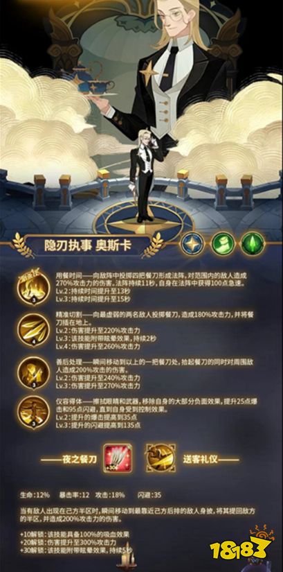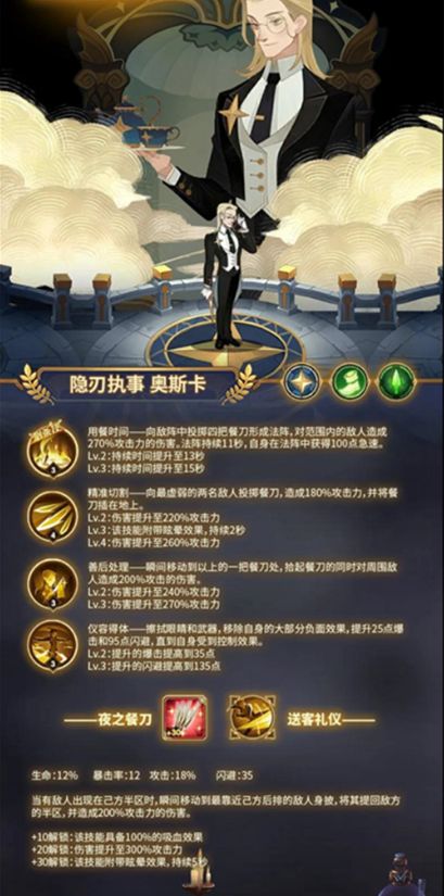 总结:隐刃执事奥斯卡的技能效果还是非常的不错的,但是并不值得重点培养哦。