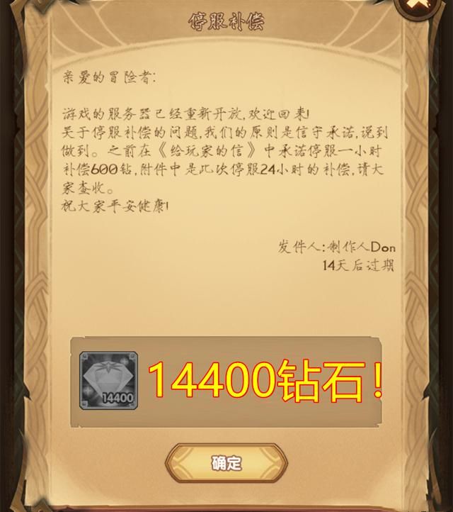 游戏每停服一个小时,就会向玩家补偿600钻石