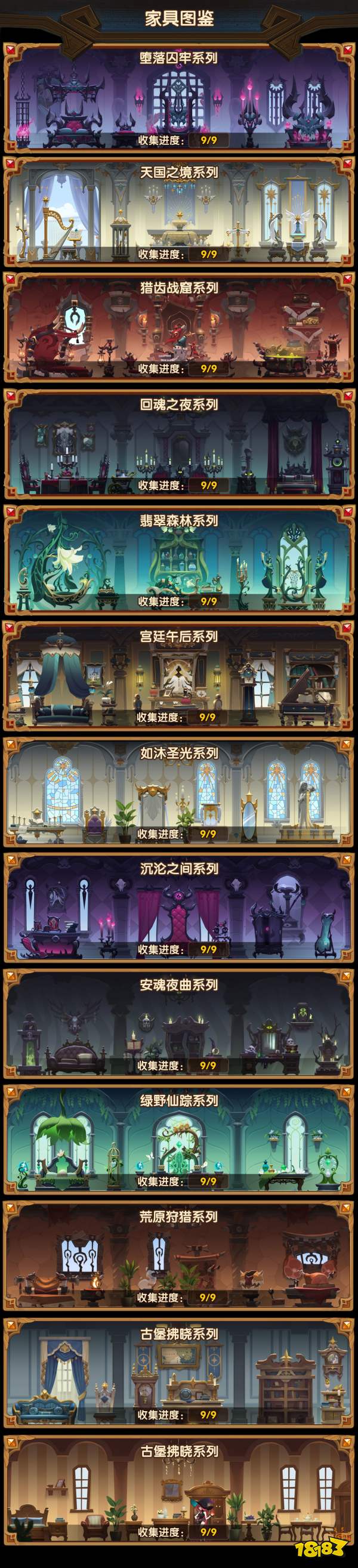 4、大家具,小家具,壁挂物这三类家具中,每层楼每类至多放置3个,任意3、9个传说家具即可激活额外的属性加成;墙纸无属性,每层至多1张;装饰物无属性,也无数量限制,您可以根据自己的喜好,尽情享受搭配的乐趣。