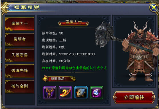 在叛军精锐面板处会详细介绍刷新时间,存在时间,掉落物品内容,以及掉落如何分配,并且有相应boss的形象。玩家可以提前组队前往等待boss刷新,毕竟boss的掉落归属是依靠伤害计算的。一定要抓紧一切时间尽可能的对boss进行最强大的输出。