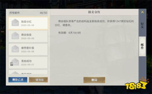 6、拍卖分红:商会通过参与活动赢得的拍品,在商会拍卖中拍出后,参与该次活动的商会成员将根据拍出的总价,以邮件形式获得拍卖分红。以钻石售出的拍品分红为绑定钻石,每个玩家获得的分红不会超过拍卖总价的3%。