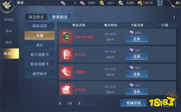 5、世界拍卖:商会拍卖结束时,所有商会在本次商会拍卖中流拍的拍品,均会自动上架至世界拍卖中。届时,达到25级的冒险家们均可在第二日的世界拍卖中挑选自己心仪的拍品,参与竞拍或是以一口价购买。