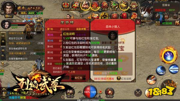 现在朋友圈逢年过节最流行的是啥?不是聚会吃饭、节日问候,而是发红包、抢红包——《烈焰武尊》也可以!如果你有点小钱不在乎那一点元宝,就可以通过发红包给全服玩家发放元宝福利!所有玩家每半小时就可抢一次红包,拿到多少全看手气。当然发红包的你也绝不会亏,只要发放了至少100元宝就可以保底BUFF奖励!如果你足够土豪,发放的元宝够多,还可进入荣誉榜,获得更加强力的BUFF加成,前三名更可获得富可敌国等专属称号!