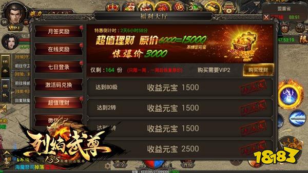 《烈焰武尊》中的理财和现实生活中大致相同,即投资一定金额并在未来获得更多收益,不同的是现实中有可能亏损,而在《烈焰武尊》中则只有血赚!现在玩家可在福利大厅超值理财页面花费3000元购买理财,达到一定等级和转生条件后即可累计获得150000元宝收益,真的是大赚特赚!现在半价,两天后超值理财就会恢复6000元宝原价,还没有购买的朋友可要抓紧时间哦~