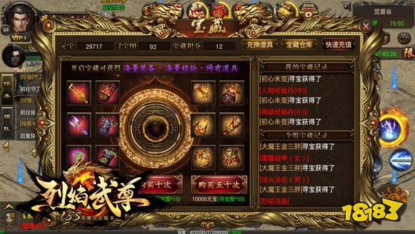 最刺激的来了!在宝藏玩法中,花费200元宝即可购买一次开启宝藏的机会,有机会搏得海量装备、经验和稀有道具,玩的就是心跳!“如果开到的都是道具怎么办?”——可能你会有这样的担心。别怕,开启宝藏的同时还会自动获得寻宝积分,积分同样可以兑换稀有装备,而且这些装备比开启宝藏得到的只好不差!既有夺宝的乐趣,还有超值的保底,还不来试一试?