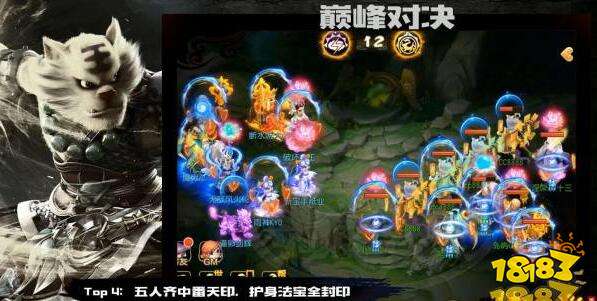 第12回合,观战方月宫被失心封,对战方的方寸月宫被失心封着,对战方的方寸一个玉清好不容易解救小伙伴于封印之中,观战方的方寸带领之下,一起向对战方丢了一波番天印,对战五人齐中番天印,身上的主动和被动法宝全部被封印,没有七宝玲珑灯解除异常,没有仙衣护体了,接下来的几回合,对战方有点难受了。