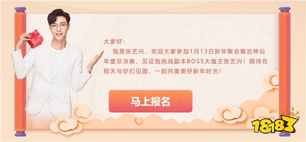新年到,喜气来!在无数少侠的期待下,艺兴线下见面会正在紧锣密鼓地筹备之中。1月13日,艺兴即将出现在武神坛年度总决赛上海线下赛现场,邀请少侠一同见证他挑战副本BOSS大魔王张艺兴的时刻!如果少侠想要在现场一睹艺兴英姿,那么就要抓住最后机会,报名活动了!