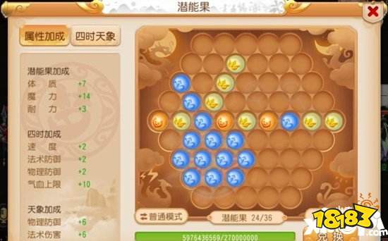 勇武有24个潜能果可以摆出四个四时和两个天象,个人比较喜欢综合的——彗星袭月(法术伤害+6)和九星连珠(物理防御+6),这套不管是敏龙还是龟速龙都适用。(潜能果不像经脉有两套可以互相转换)