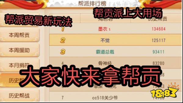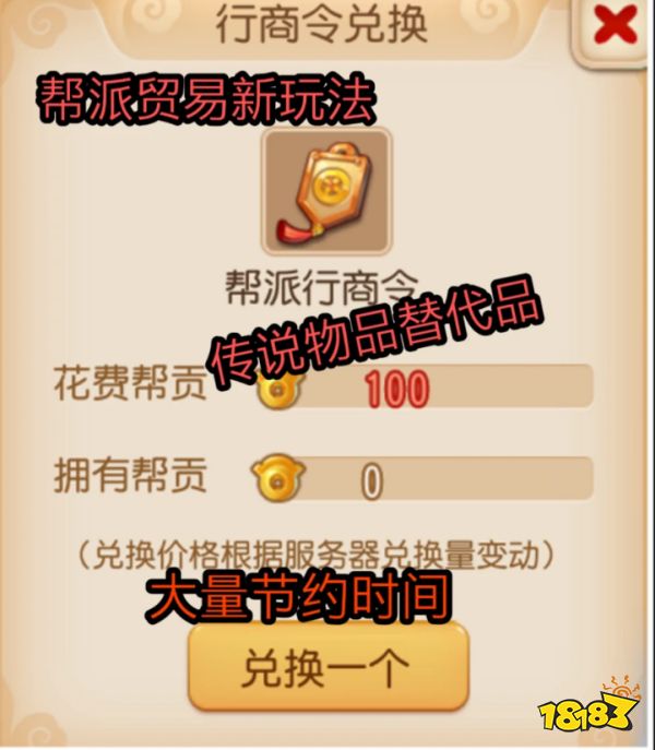 新模式帮派初级贸易则取消了传说,道具获取方式改为通过帮派行商令完成,那么什么是帮派行商令呢?帮派行商令就是可以完成初级贸易中寻物环节的道具任务一个特殊道具。它的获取只能通过帮派活动或使用帮贡兑换(初始100帮贡一个),通过这个举措,想必大家参与帮派活动的积极性就充分的调动了起来,帮贡以后会是一个好东西。