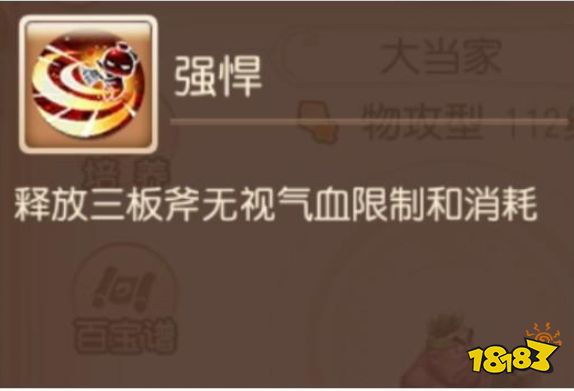 技能[强悍]释放三板斧无视气血限制和消耗[嗜杀]每当有单位死亡,都会增加一定的伤害,最多6层,死亡后效果减半,铸就了他后期无敌的威名。