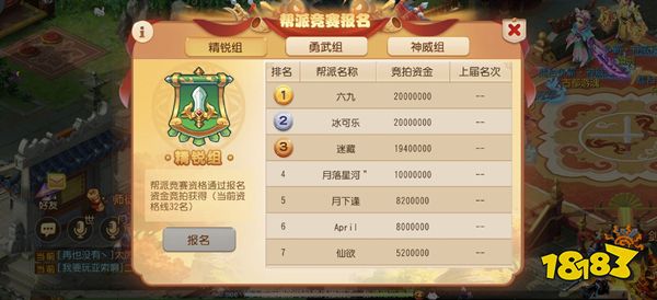 现在,身处测试区的帮派帮派可以根据帮派玩家等级分布,选择参与精锐、勇武、神威三个组别之一的帮派。高等级玩家在参与比自己参赛组别高的比赛时,其战斗属性也会按照比例调整。在确定好帮战参赛组别后,玩家即可使用帮派资金竞拍参赛资格。排名高的帮派可以获得当前轮次共八周的参赛资格,与其他帮派一起对战!