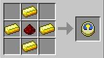 合成表:在工作台中,由1个红石粉和4个金锭以图中的排列来合成出一个钟