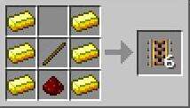 合成:在工作台中,6个金锭加1个红石粉、一个木棍木板按上图铺开可以获得6个充能铁轨