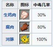 腐肉会有80%的几率导致食物中毒,生鸡肉只有相对比较少的几率会导致食物中毒(30%)。而河豚一定会带来食物中毒的状态(同时会带来饥饿和反胃的状态)。