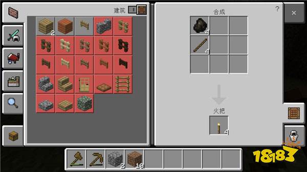 做完木炭后,我们去工作台,找到火把的图标,用木棍和木炭就可以合成火把了!