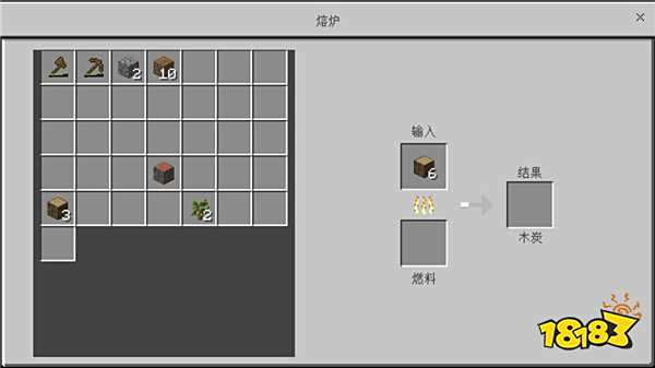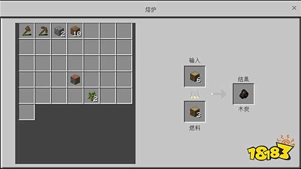 我们把一块树干放在燃料栏里,把几块树干放在材料栏里,中间的火苗标志会亮起来,表示正在熔炼。熔炼完成后,一块木炭就诞生了!