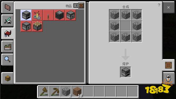 把自己围起来后天已经黑了,这个时候伸手不见五指,我们需要找到光源。让我们去工作台,进入制作界面后找到熔炉的图片,用圆石制作熔炉。
