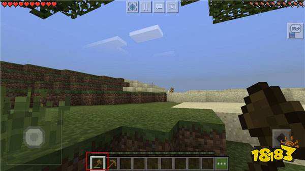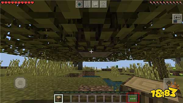 我们走到橡木附近,就会自动捡起,仔细看手上是不是有了一块橡木?(如果此时你手上已有其他物品,橡木就会自动收集到快捷物品栏中)。画面下方有9个格子,是我们的快捷物品栏,我们在这个物品栏内就可以随时切换自己手持的物品。