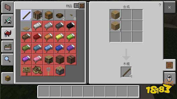 把橡木都做成橡木板后,我们在物品栏里找到木棒的标志并点击,2块橡木板可以做4根木棍。