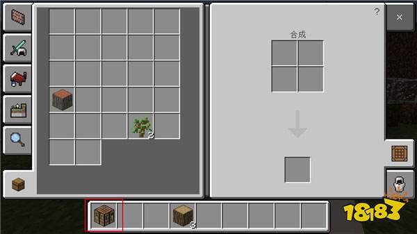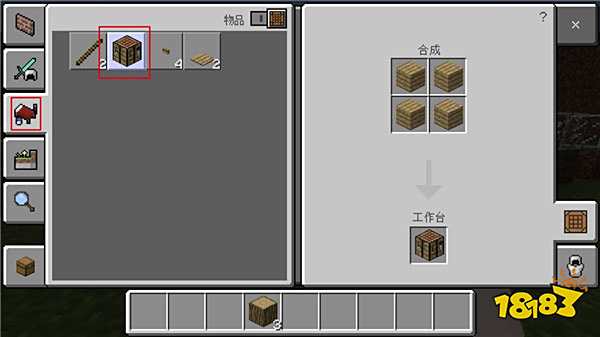 我们继续在物品栏里找到工作台的标志,点击工作台后,随身物品制作栏就会自动出现工作台。点击工作台,4块橡木板消失,1个工作台就完成了!
