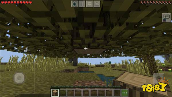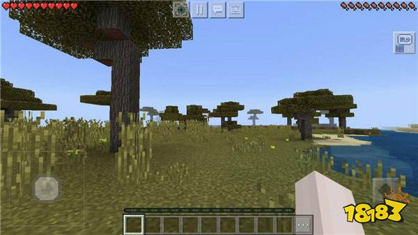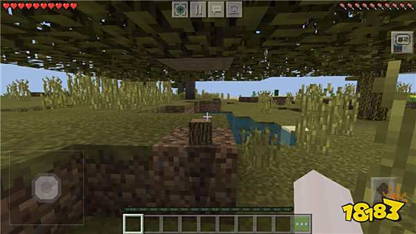 假如我们运气好出生在资源齐全的环境里,那第一天就比较好过了。先看一下我们的周围,有树、有水,还有可爱的小动物,这就是资源齐全的世界。操作画面左侧的按键或摇杆即可进行移动,我们走到一棵橡树前面。