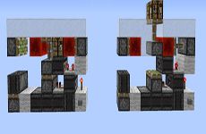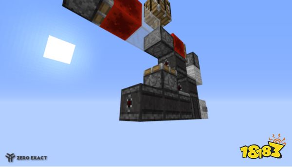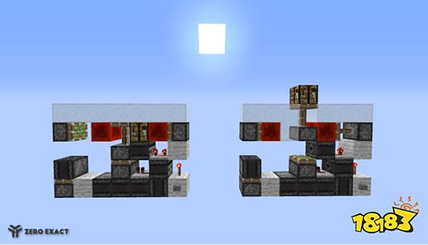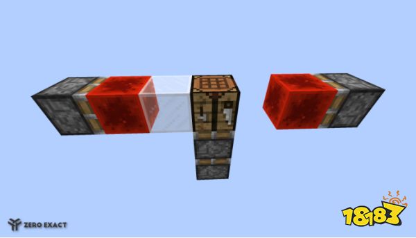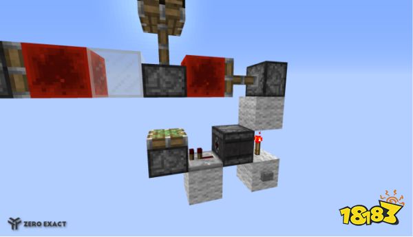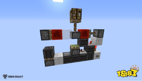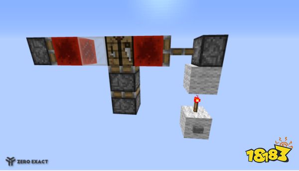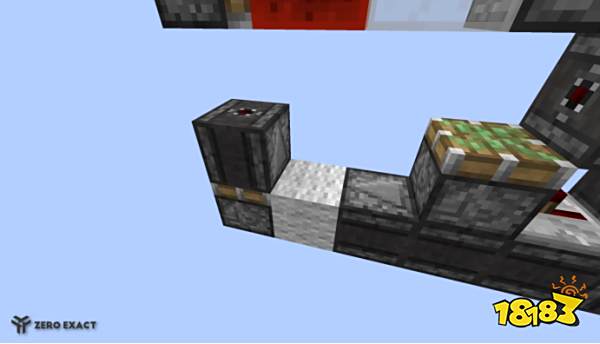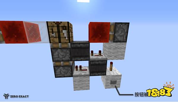 8. 如图放置一个向上的粘性活塞,并且在其上放置一个朝上的侦测器。在按下按钮时,这个推动着侦测器的粘性活塞会先将侦测器推出再收回,上方推动着红石块的粘性活塞将会推出红石块而不收回。