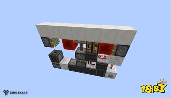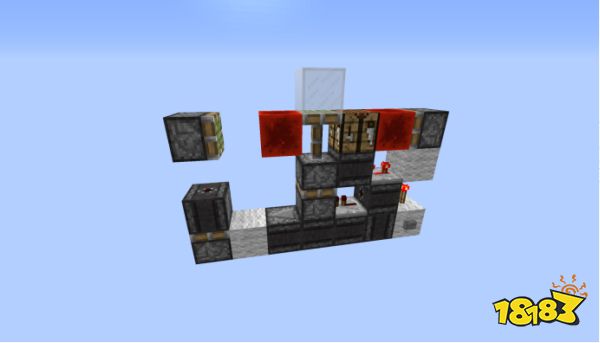 1. 如图所示,摆出机械结构。本文所有活塞均为粘性活塞。如果要在地面上实现隐藏效果,需要往下挖四格深,然后开始摆放装置。