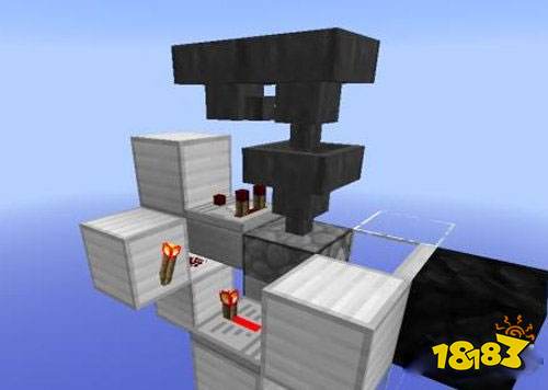 然后这边注意一下比较器检测的是投掷器上方的漏斗,并且比较器下面是半砖,防止点状红石充能到投掷器,并且红石火把前的中继器是满档,这一部分是控制活版门的: