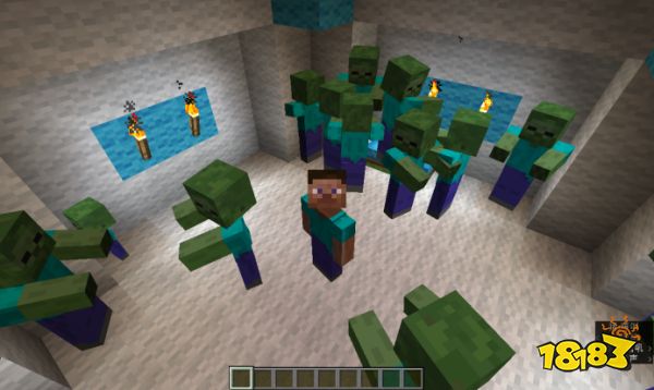 在第一个夜晚,史蒂夫手无寸铁的时候僵尸们就围了上来,然后在惊慌中被僵尸杀死重新复活,所以僵尸这种锲而不舍的怪物在游戏中绝对是恐惧的源头之一。